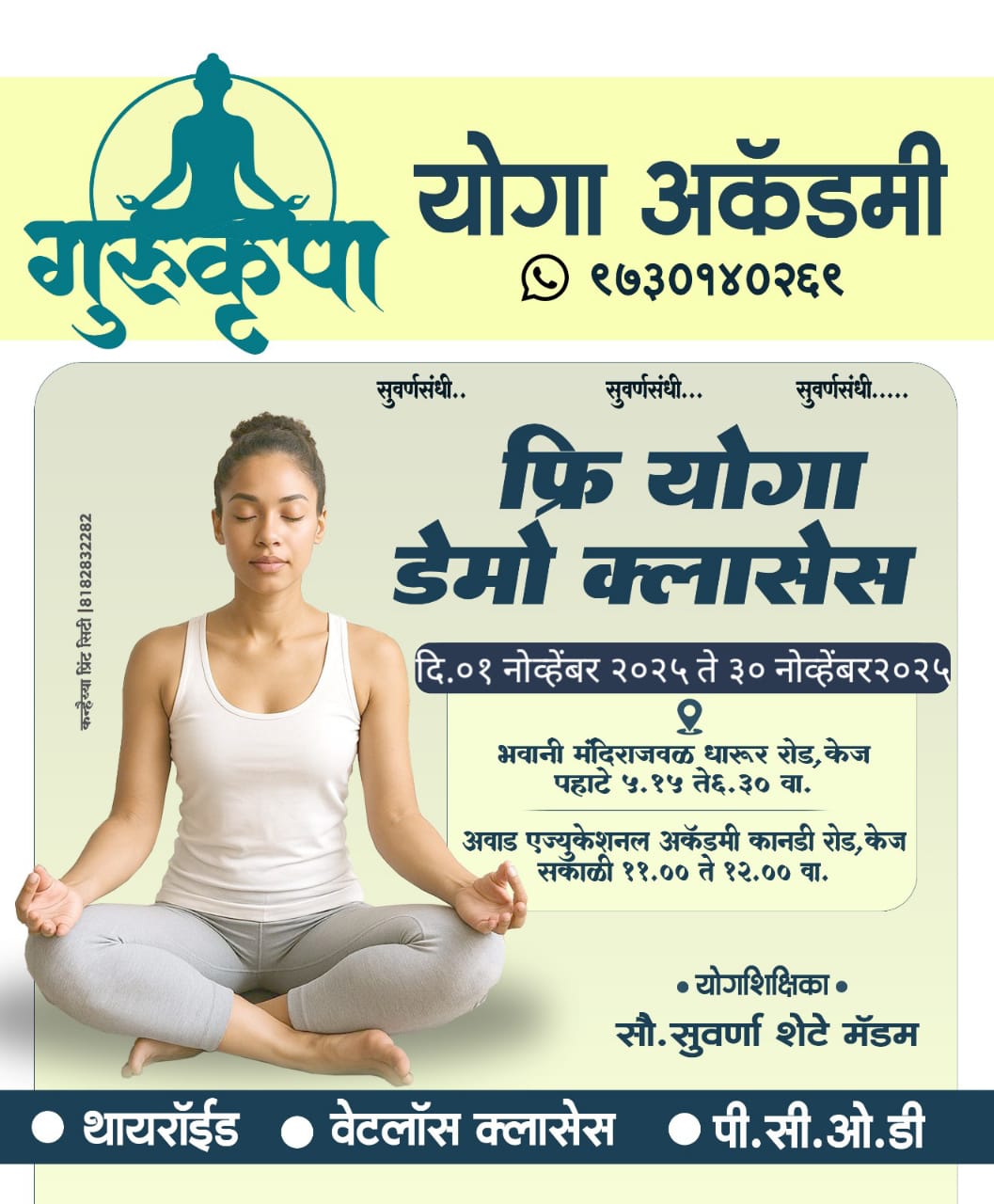 केज शहरामध्ये मागील काही महिन्यांपासून कार्यरत असलेल्या गुरुकृपा योगा अकॅडमी कडून महिला,पुरुष व लहान मुलांसाठी एक महिन्याचे मोफत योगा डेमो क्लासेसचे आयोजन करण्यात आले आहे.दि/01 नोव्हेंबर ते 30 नोव्हेंबर 2025 दरम्यान या क्लासचे आयोजन करण्यात आले आहे. पहाटे सकाळी 5.15 ते 6.30 यावेळेत भवानी मंदिर,धारुर रोड,केज येथे व सकाळी 11.00 ते 12.00 यावेळेत आवाड एज्युकेशनल अकॅडमी, कानडी रोड केज येथे या क्लासचे आयोजन करण्यात आले आहे.यामध्ये महिला-पुरुषांचे विविध शारीरीक समस्या,लहान मुलां मधील स्थूलता याविषयी माहिती देवून योगासने करून घेतली जाणार आहेत.तरी जास्तीत जास्त महिला पुरुषांनी व लहान वयोगटातील मुलांनी या एक महिन्याच्या मोफत क्लासचा लाभ दोन्ही वेळे पैकी आपल्या सोयीच्या वेळे नुसार घ्यावा असे आवाहन संचालिका योगशिक्षिका सुवर्णा शेटे यांनी केले आहे.