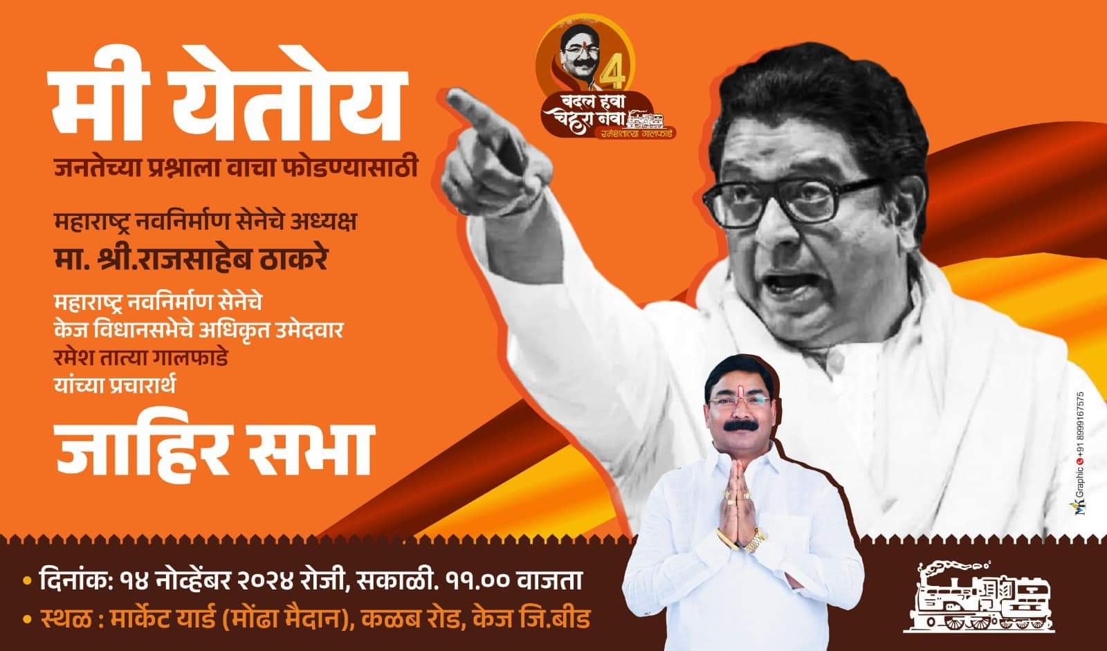 महाराष्ट्र नवनिर्माण सेनेचे अध्यक्ष राजसाहेब ठाकरे दि.14 नोव्हेंबर 2024 रोजी केज मध्ये ठाकरे यांची जाहीर सभा होणार आहे केज विधानसभा मतदारसंघासाठी महाराष्ट्र नवनिर्माण सेनेकडून रमेश गालफाडे यांना उमेदारी मिळाल्यानंतर त्यांच्या प्रचारार्थ राज ठाकरे यांची जाहीर सभा मोंढा मैदान केज होणार असून या सभेत राज ठाकरे काय बोलणार याकडे सगळ्याचे लक्ष लागले आहे.या सभेला केज मतदार संघातील मतदार बांधवांनी जास्तीत जास्त उपस्थित राहावे असे आवाहन मनसेचे उमेदवार रमेश तात्या गालफाडे यांच्या वतीने करण्यात आले आहे