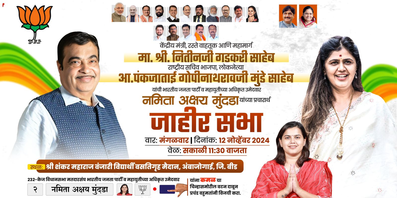 बीड जिल्ह्यात विकासात्मक राजकीय नेतृत्व असणार्या घराण्यांमध्ये अंबाजोगाई च्या मुंदडा घराण्याचा समावेश अनिवार्य आहेच नमिता मुंदडा ह्या उच्चशिक्षित, अभ्यासु नेतृत्व आहे त्यामुळे आज केंद्रीय मंत्री रस्ते वाहतूक आणि महामार्ग मा नितीन गडकरी साहेब व पंकजाताई मुंडे ह्या नमिता ताई अक्षय मुंदडा यांच्या प्रचारार्थ अंबाजोगाई येथील जाहीर सभेला प्रमुख उपस्थिती राहणार आहे या सभेचे ठिकाण श्री शंकर महाराज वंजारी विध्यार्थी वसतिगृह,मैदान अंबाजोगाई येथे होणार आहे तरी जास्तीत जास्त मतदान बंधु भगिनी यांनी या सभेला उपस्थित राहावे असे आवाहन केज मतदार संघाच्या उमेदवार नमिताई अक्षय मुंदडा यांनी केले आहे