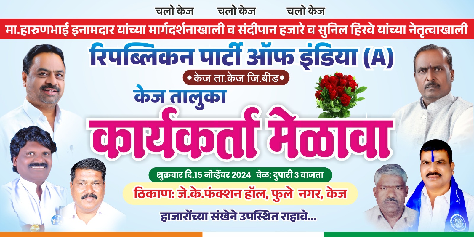 केज विधानसभा निवडणुकीनिमित्त रिपब्लिकन पार्टी ऑफ इंडिया ए चा कार्यकर्ता मेळावा हारुणभाई इतर इनामदार यांच्या मार्गदर्शनाखाली व संदिपान हजारे, सुनील हिरवे यांच्या नेतृत्त्वाखाली शुक्रवार रोजी दुपारी तीन वाजता भव्य कार्यकर्ता मेळावा आयोजित करण्यात आला आहे या मेळाव्याला हजारोंच्या संख्येने उपस्थित रहाण्याचे आवाहन संदिपान हजारे, सुनिल हिरवे यांनी केले आहे या वेळी कार्यकर्त्यांना मोलाचे मार्गदर्शन करण्यात येणार आहे कांही दिवसावर विधानसभा निवडणुका आल्या आहेत त्या अनुषंगाने हा कार्यकर्ता मेळावा आयोजित करण्यात आला आहे या वेळी हारुणभाई इनामदार यांचे मोलाचे मार्गदर्शन होणार आहे हारुणभाई यांनी पृथ्वीराज साठे यांचे हात बळकट करण्यासाठी या मेळाव्याचे आयोजन केले आहे