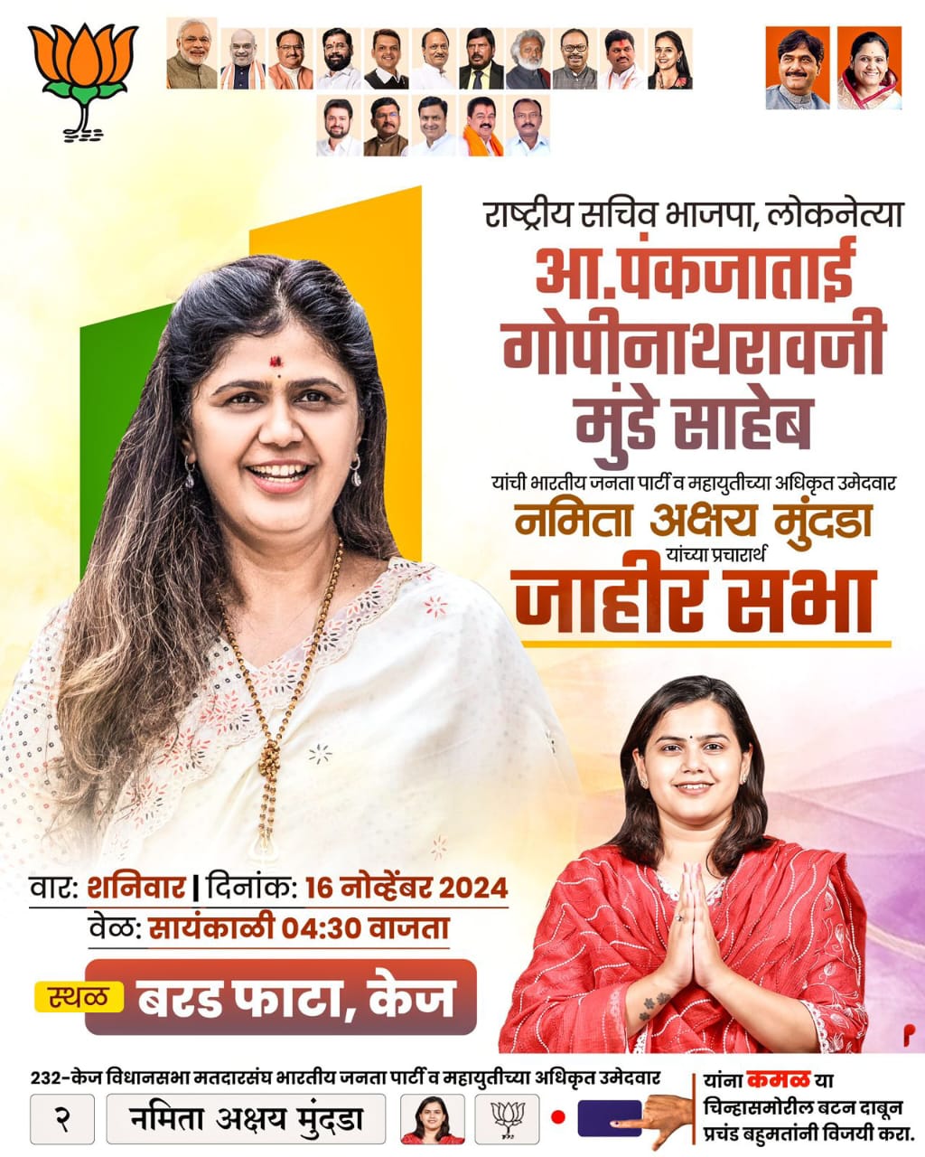केज विधानसभा मतदारसंघाच्या भाजपाच्या उमेदवार नमिता ताई अक्षय मुंदडा यांच्या प्रचारार्थ केज तालुक्यातील बरड फाटा येथे भाजपाच्या राष्ट्रीय सचिव लोकनेत्या पंकजाताई मुंडे यांची भारतीय जनता पार्टी व महायुतीच्या उमेदवार नमिता ताई अक्षय मुंदडा यांच्या प्रचारार्थ बरड येथे जाहीर सभेचे उद्या 16 नोव्हेंबर रोजी सायंकाळी 4-30 वाजता भव्य सभेचे आयोजन केले आहे, या सभेने केज मतदार संघात परीवर्तन नक्की घडणार असल्याचे बोलले जात आहे पंकजाताई मुंडे या सभेला संबोधित करणार आहेत त्या काय बोलणार या कडे केज मतदार संघाचे लक्ष लागले आहे नमिता ताई मुंदडा यांना विजयी करण्यासाठी महायुती चे सर्व कार्यकर्ते जोमाने कामाला लागले आहेत उद्याच्या सभेला हजारोंच्या संख्येने उपस्थित राहा असे आवाहन भारतीय जनता पार्टी व महायुतीच्या वतीने करण्यात आले आहे
