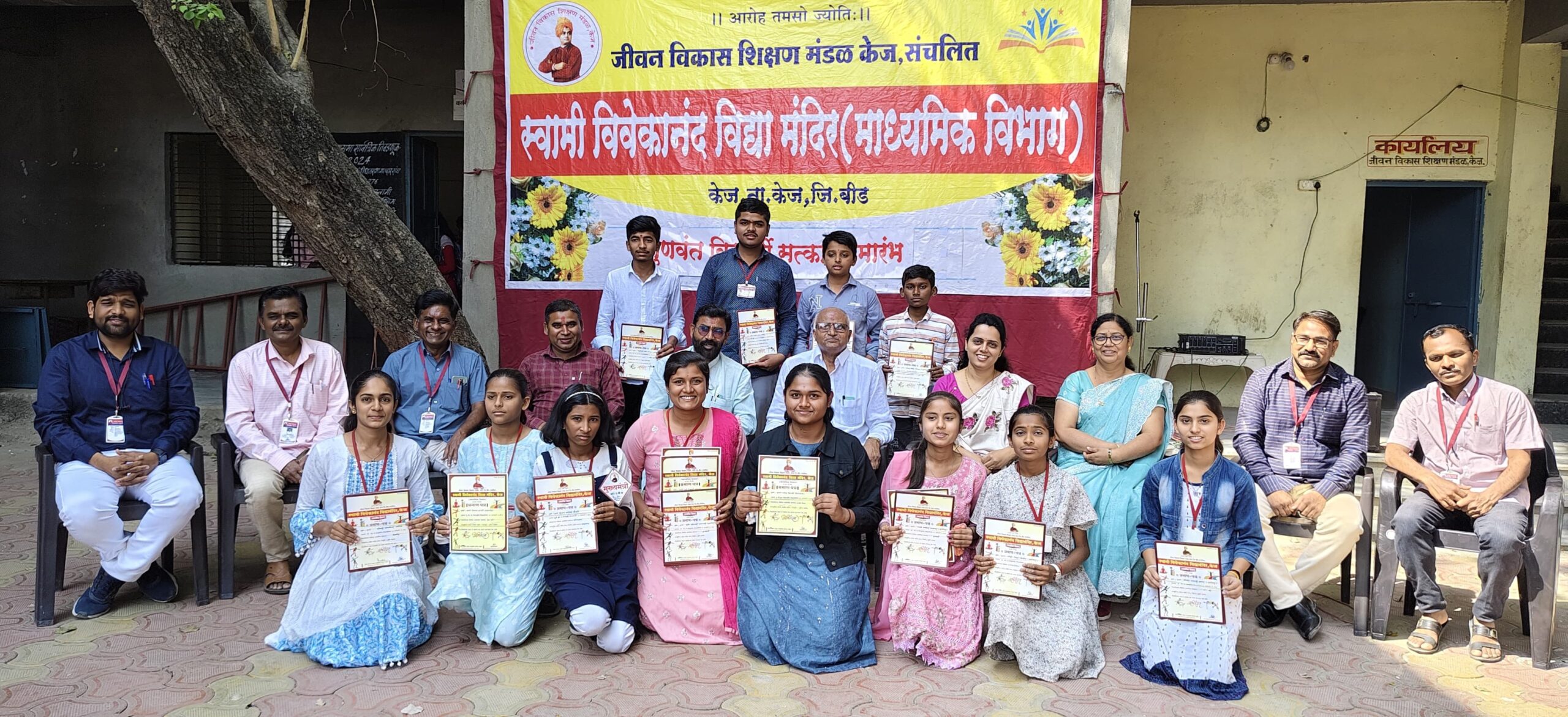 जीवन विकास शिक्षण मंडळ केज संचलित, स्वामी विवेकानंद विद्यामंदिर ( मा. वि. ) या शाळेमध्ये दि. ६ फेब्रुवारी २०२५ रोजी शैक्षणिक वर्ष २०२४-२५ मधील शालेय अंतर्गत तसेच विविध स्पर्धेमधील घवघवीत यश संपादन केलेल्या गुणवंत विद्यार्थ्यांचा सत्कार समारंभ सोहळा अत्यंत हर्षोत्साहात संपन्न झाला. याप्रसंगी कार्यक्रमाचे अध्यक्ष म्हणून जीवन विकास शिक्षण मंडळाचे सचिव गिन्यानदेव गदळे, प्रमुख पाहुणे म्हणून सेवानिवृत्त शिक्षक हनुमंतराव घाडगे, इतर उपस्थितीमध्ये पोस्टमन म्हणून कार्यरत असणारे अंकुश चाटे, शालेय व्यवस्थापन समितीच्या अध्यक्षा शैलाताई इंगळे, शाळेच्या मुख्याध्यापिका शिवनंदा मुळे आदी उपस्थित होते.